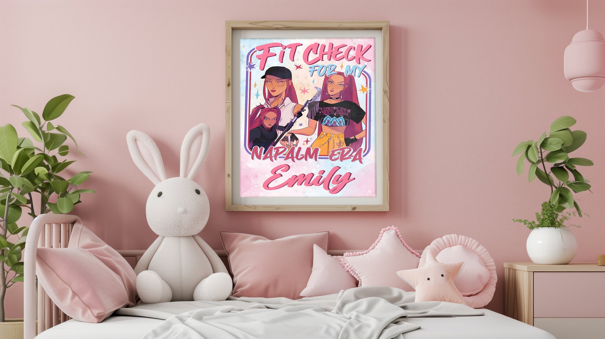 Get ready to level up your wall décor with this vibrant ''Fit Check'' Kpop personalised name print! Pop it in your favourite frame and watch your space instantly transform into a fan's paradise. Whether you're sprucing up a bedroom, playroom, or hunting for the ultimate gift for a K-pop obsessed friend, this cheeky custom print brings all the personality and pizzazz you need. Pure pop perfection!