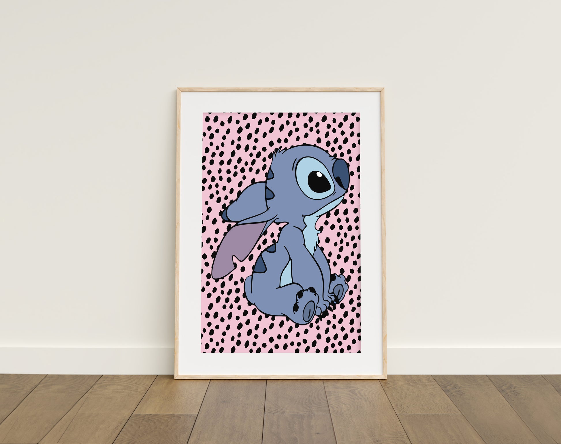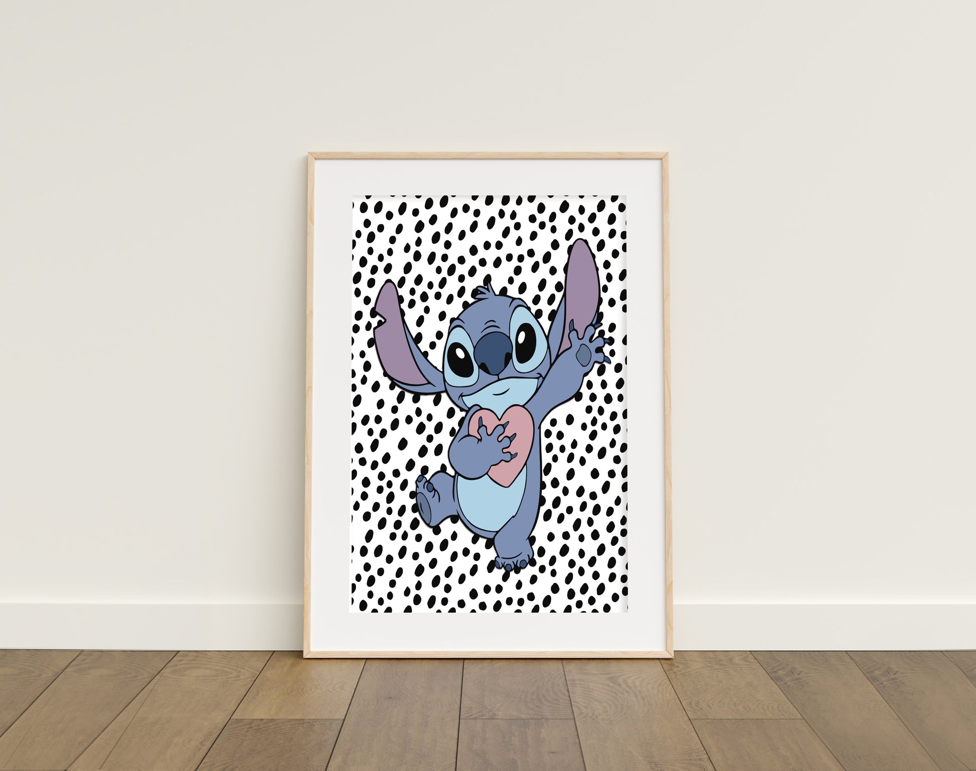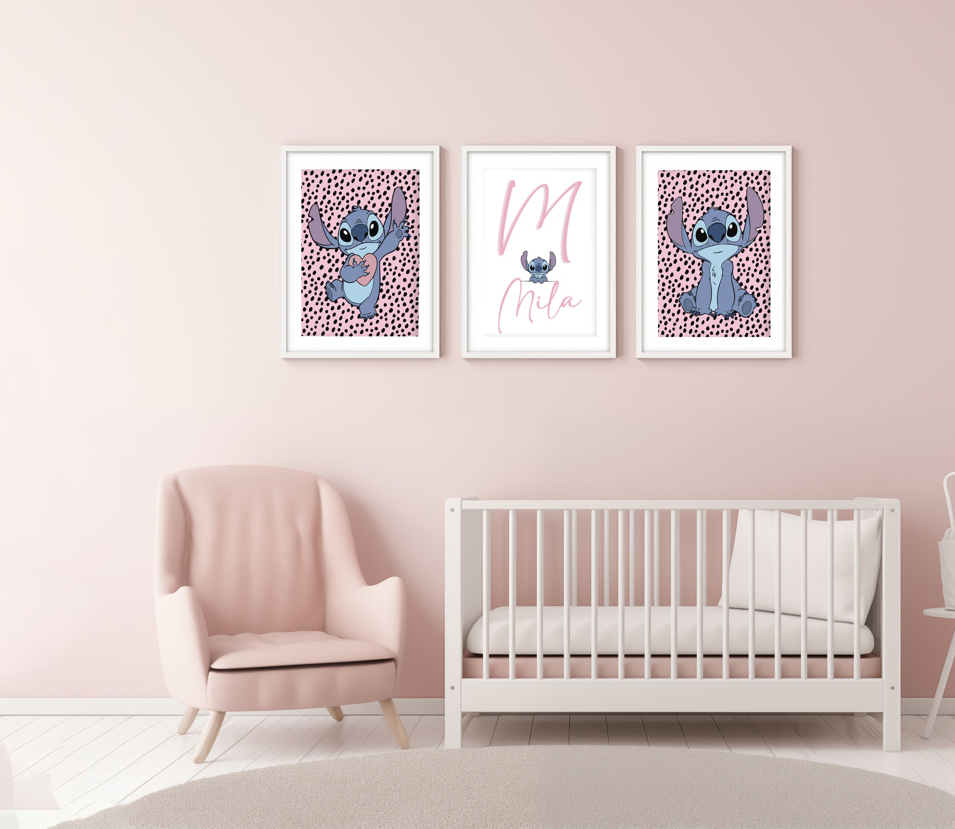 A fun personalised set of three, Stitch and Angel prints featuring a playful dalmatian background, available in cheerful pink, mint green, and blue/white colours.