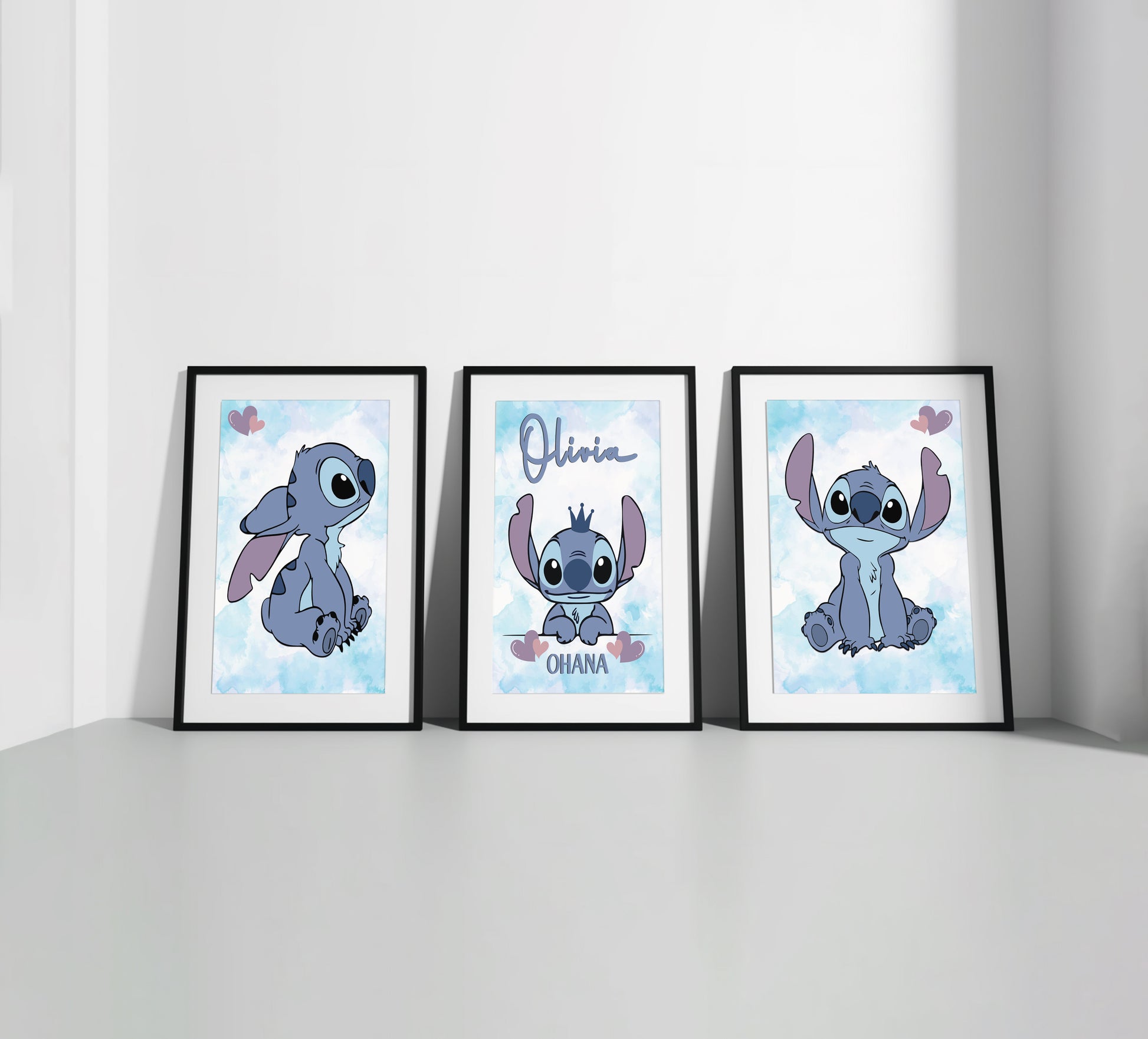Bring a touch of Stitch’s magic to your child’s room with this charming trio of personalised prints featuring a soft watercolour backdrop. Highlighting the adored characters Stitch and Angel, these beautiful artworks are perfect for brightening up any bedroom, nursery, or play space. Delight a Lilo and Stitch enthusiast with this enchanting set that makes an unforgettable gift.