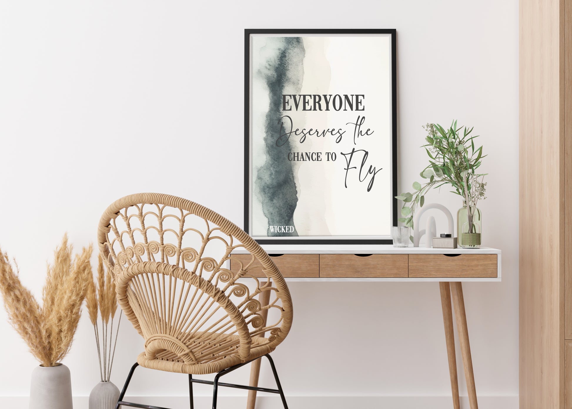Celebrate the magic of Wicked with this stunning quote print featuring Elphaba's iconic "Defying Gravity" moment. The design captures the empowering message "Everyone Deserves The Chance To Fly" in a beautifully understated colour scheme that complements any décor. Unframed and ready for your favourite frame, it's the perfect standalone piece or pairs brilliantly with other prints to create a gallery wall. Whether you're treating yourself or surprising a devoted Wicked enthusiast, this print brings theatrical charm and inspiration to your home.